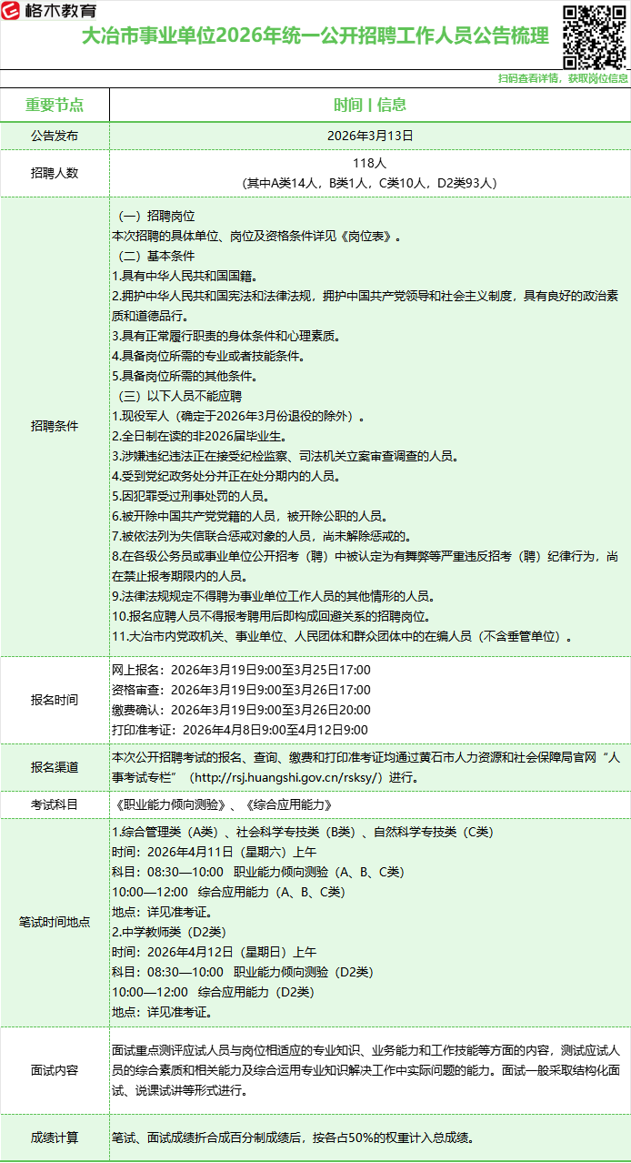 2026年黄石大冶市事业单位统一公开招聘118人,报名时间为2026年3月19日9:00至3月25日17:00。本次公开招聘考试的报名、查询、缴费和打印准考证均通过黄石市人力资源和社会保障局官网“人事考试专栏”(http://rsj.huangshi.gov.cn/rsksy/)进行。事业单位ABC类岗位笔试时间:2026年4月11日(星期六)上午,事业单位D类笔试时间:2026年4月12日(星期日)上午,笔试时间地点笔试准考证。